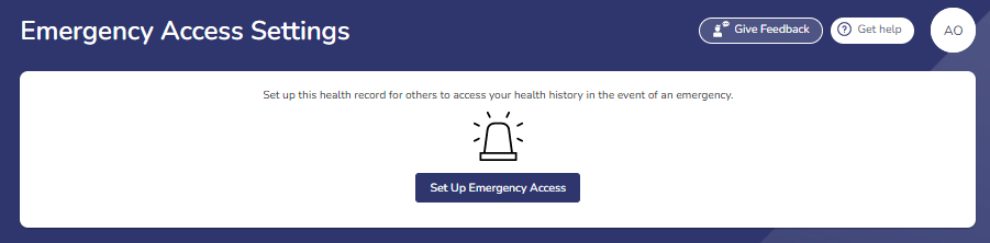 Emergency Access is used to allow other to access your health history in the event of an emergency. To get started, click the Set Up Emergency Access button.